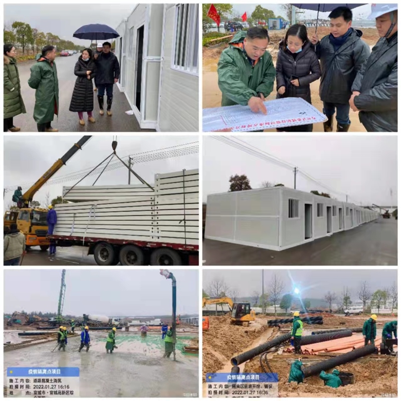 1月27日下午,宣州區(qū)政府副區(qū)長(zhǎng)范瀟瀟到疫情防控臨時(shí)隔離點(diǎn)施工現(xiàn)場(chǎng),查看工程施工進(jìn)展情況,并充分肯定了項(xiàng)目施工進(jìn)展速度。截止晚上18:00,疫情防控臨時(shí)隔離點(diǎn)項(xiàng)目集裝箱板房材料到場(chǎng)180多套,完成160套集裝箱板房拼裝;炷恋缆贰⒂晡鬯艿篮臀鬯幚碓O(shè)施同步進(jìn)行。面對(duì)即將到來(lái)的低溫雨雪冰凍天氣,區(qū)國(guó)資集團(tuán)積極組織協(xié)調(diào)各項(xiàng)施工安排,施工人員全體上下團(tuán)結(jié)一心,以堅(jiān)決態(tài)度克服難關(guān),全力推進(jìn),高質(zhì)量完成項(xiàng)目建設(shè)。