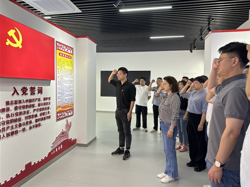 會前,集團黨建園地內(nèi),董事長楊靜帶領全體黨員重溫入黨誓詞,為上半年過政治生日的同志贈送政治生日賀卡。