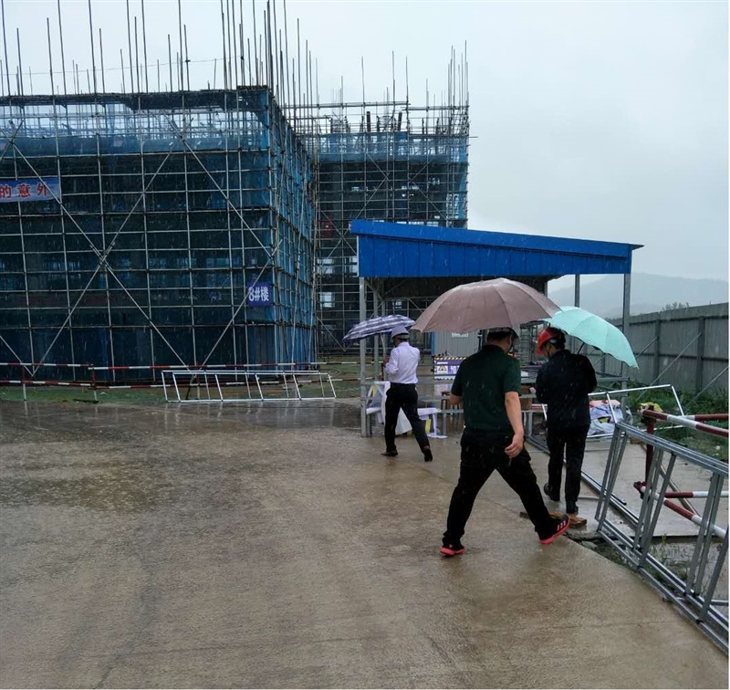 工作人員冒雨帶領(lǐng)客戶查看砂石資源處置現(xiàn)場(chǎng)